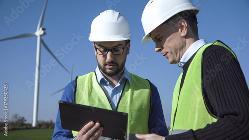 Two engineers wearing hard hat discussing over digital table against turbines on wind farm