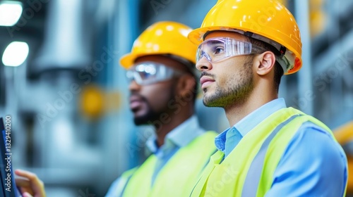 Two engineers wearing hard hats and safety vests collaboratively reviewing and analyzing inventory data displayed on a computer screen in a modern
