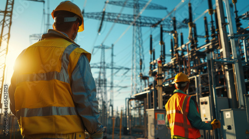 Two engineers wearing safety gear inspect a high-voltage electrical substation at sunrise, ensuring operational efficiency and safety.