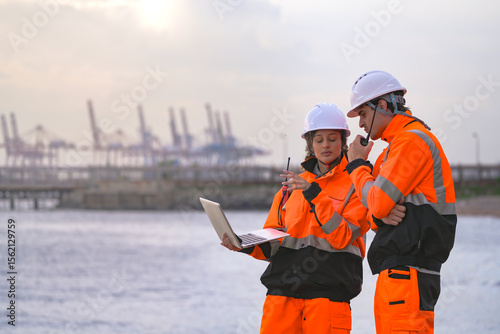 Two engineers wearing safety uniforms and hard hats communicate using a radio while reviewing data on a laptop by the sea during sunset. Maritime industrial setting.