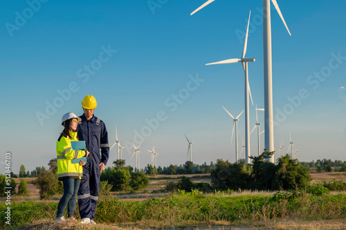 Two engineers working and holding the report at wind turbine farm Power Generator Station on mountain,Thailand people,Technician man and woman discuss about work