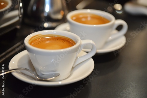 Two Espresso cups with coffee. Freshly brewed espresso shots on a dark wooden table with copy space, background, caffeine. Espresso cups, spoons, saucers. Refreshing hot cup of strong coffee at a cafe