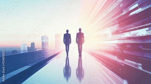 Two figures walking towards a bright future.