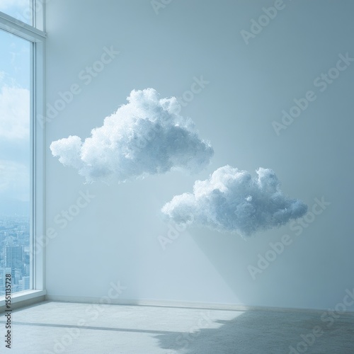 Two fluffy clouds float against a minimalist white wall, near a large window overlooking a city. Sunlight casts shadows