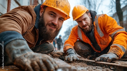 Two focused laborers collaborating outdoors with heavy equipment, highlighting the camaraderie and shared effort in construction and industrial work under challenging conditions.