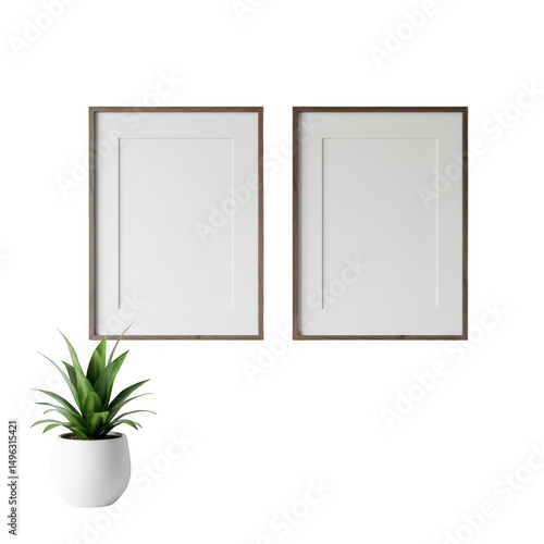 Two frames and plant isolated on transparent background, for wall decor mockups.
