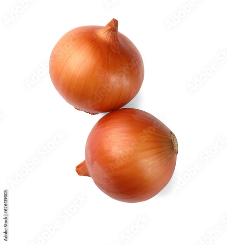 Two fresh onions on white background, top view