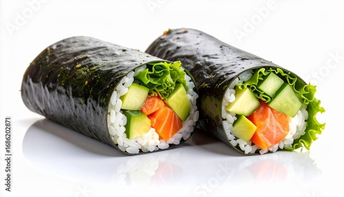 Two Fresh Salmon Sushi Burritos with Avocado and Lettuce on White Background