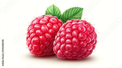 Two freshly picked ripe raspberries with green leaves on display