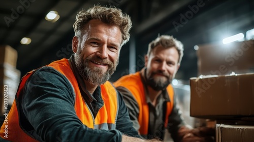 Two friendly male workers smiling for the camera while wearing safety vests, exuding teamwork and positivity in a warehouse environment filled with boxes.