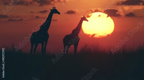 Two giraffes standing in the grass in front of a setting sun