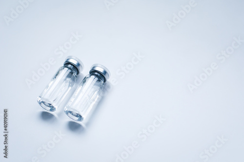 Two glass bottles with liquid on gray background with copy space. The medical conception of combating the covid-19 pandemic. Flu vaccination. Flat lay