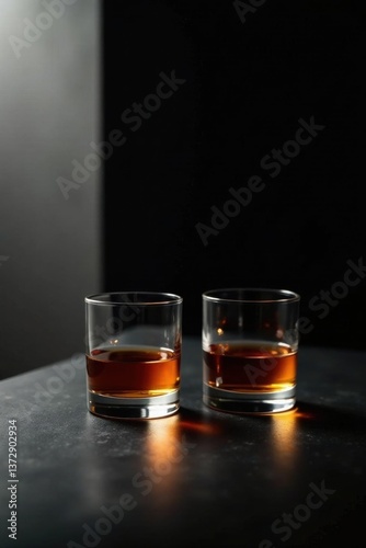 Two glasses of amber liquid rest on a dark surface, illuminated by a soft light, suggesting a moment of quiet contemplation or relaxed enjoyment.