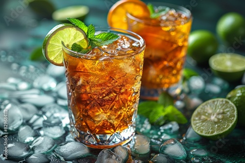 Two glasses of iced tea garnished with lime surrounded by ice cubes and lime slices