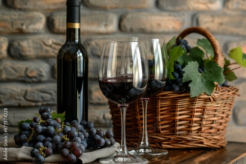 Two glasses of red wine are standing on a table with a bottle of wine and a basket of grapes