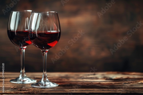 Two glasses of red wine on an old rustic wooden table with a warm, cozy atmosphere