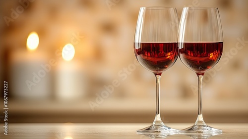 Two glasses of red wine on beige background, creating a romantic dinner concept.