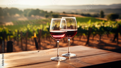 Two glasses of red wine resting on a rustic wooden table, in the background the panorama of a vineyard at sunset