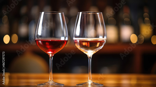 Two glasses of wine white and red standing on bar counter in pup or restaurant. Nightlife, celebration and entertainment concept. Horizontal, wide screen banner format,, generative ai