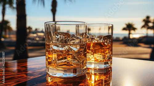 Two glasses with rum and ice against background of the sea at sunset, vacation time. AI generated