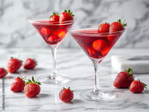 Two glasses with strawberry cocktail on marble background. For summer drink recipe, party invitation or menu design.