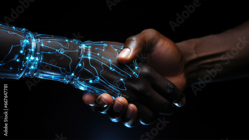 Two glowing hands in a wire frame, technology handshake, intelligence, robots background, generative AI