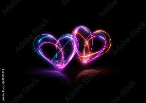 Two glowing neon hearts vector illustration with pink and purple light effects on black background, romantic fantasy design with magical energy swirls and colorful luminous details in 2d style
