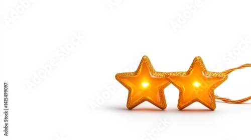 Two gold glitter star shaped lights illuminate against a white background. A festive, minimalist image.