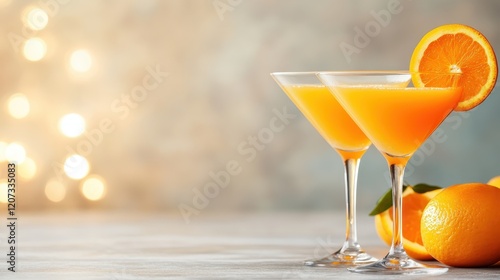 Two gorgeous orange cocktails highlight a cozy atmosphere, with warm tones and soft illumination, making them the perfect accompaniment for intimate gatherings and celebrations.