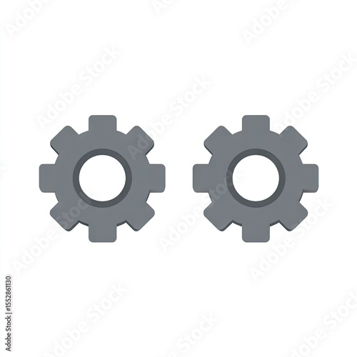 Two grey, interlocking cogwheels, simplified design, isolated on white background. They represent machinery, mechanics, and teamwork