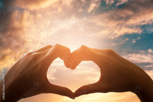 Two hands are getting heart shape formation with the sun light passing through the hands.