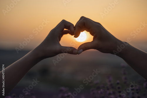 Two hands forming a heart shape in front of a purple field. The sun is setting in the background, creating a warm and romantic atmosphere.