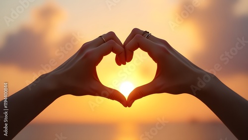 Two hands forming a heart shape with fingers against a blurred sunset background