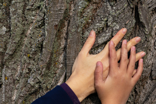 two hands on a background of tree bark.