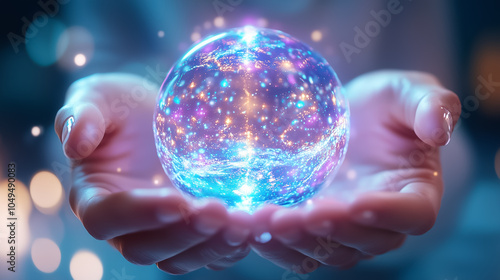 Two hands present a glowing holographic Earth, illuminated with colorful stars, set against a dark background
