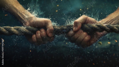 Two hands pulling a rope with water splashing, symbolizing struggle or competition.