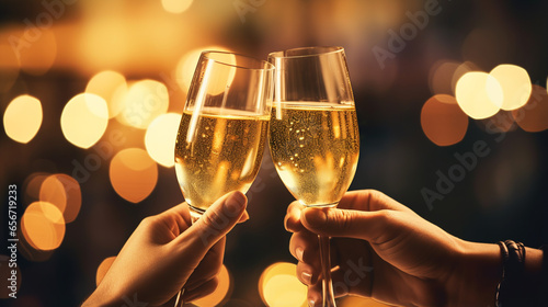 Two hands with glasses of champagne wine clink against blurred golden lights. Festive background and celebration concept. ai generative