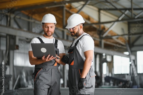 Two Heavy Industry Employees in Hard Hats Discussing Job Assignments at the Factory, Using Laptop Computer