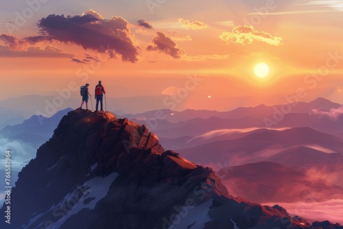 Two hikers stand side by side, silhouetted against the sun's grand descent, while the surrounding mountains are bathed in a warm, ethereal glow.