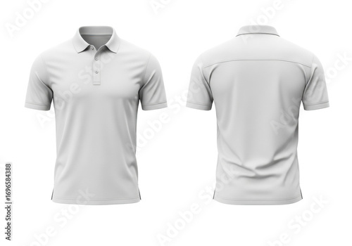 Two identical blank white short-sleeve polo shirts, front & back views, perfectly smooth & crisp on a pure transparent background, ideal product mockup concept