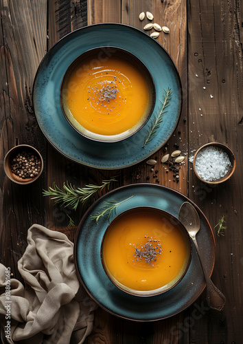 Two identical plates with pumpkin soup on dark stone table, salt, herbs, seeds, rustic style, minimalism surrounded by autumn leaves and pumpkins cozy and warm atmosphere perfect for seasonal menus