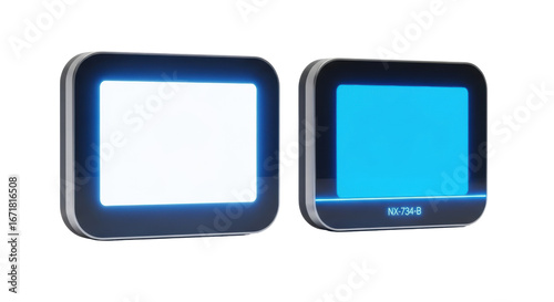 Two identical, sleek, futuristic digital display units, charcoal grey border, electric blue screens, one blank, one with 'NX-734-B', on white. Concept of future tech interface