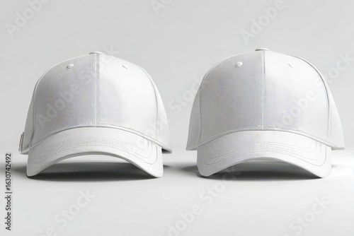 Two identical white baseball caps. Front view, on light gray surface. Flat lay. Blank, ready for design