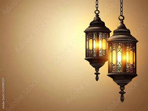 Two Illuminated Hanging Lanterns With Intricate Designs