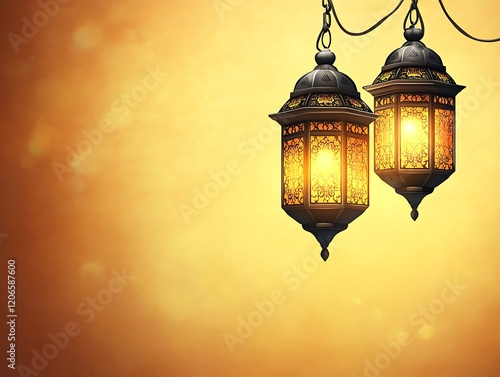 Two Illuminated Islamic Lanterns Hanging Against Warm Background