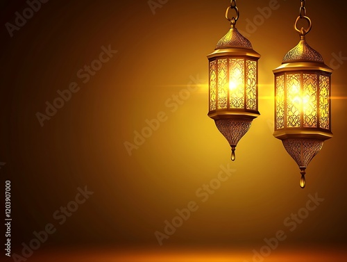 Two Illuminated Ornate Gold Lanterns Hanging Against Dark Background