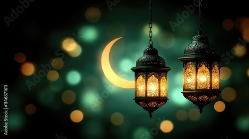 Two illuminated Ramadan lanterns hanging against a crescent moon and bokeh background.