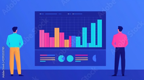 Two individuals analyzing vibrant data visualization on large screen, showcasing bar graphs and charts