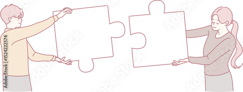 Two individuals are actively joining puzzle pieces together, representing teamwork, connection, and unity