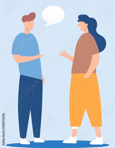 Two individuals stand and converse, using hand gestures, with an empty speech bubble above them